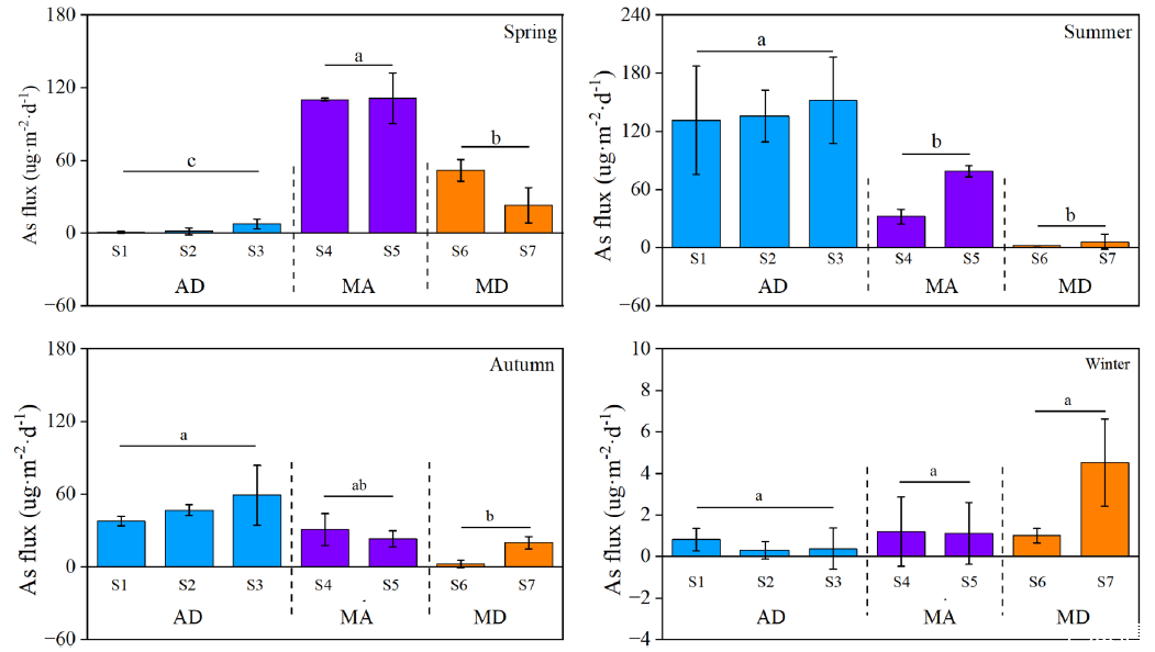 圖4、沉積物-水界面砷釋放通量變化。展示不同湖區(qū)沉積物-水界面砷釋放通量的季節(jié)性變化,通過統(tǒng)計(jì)學(xué)分析顯示組間差異的顯著性。