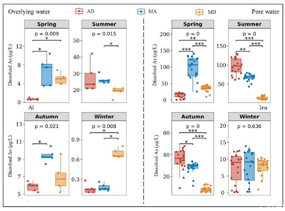 研究結(jié)果表明AD和MD系統(tǒng)的砷釋放呈現(xiàn)顯著季節(jié)性差異。在AD區(qū)域,夏季和秋季孔隙水中溶解砷濃度最高(峰值達(dá)120.36μg/L),釋放通量顯著增強(qiáng);而MD區(qū)域則在春季出現(xiàn)砷釋放高峰(34.92μg/L),夏季反而表現(xiàn)為砷固定。這種反差挑戰(zhàn)了“溫度升高必然促進(jìn)砷釋放”的常規(guī)認(rèn)知。機(jī)制分析表明,在AD夏季,高溫促進(jìn)微生物活動,導(dǎo)致鐵氧化物還原溶解,同時(shí)孔隙水中磷含量升高(競爭吸附位點(diǎn)),共同驅(qū)動砷釋放。相反在MD春季,大型植物殘?bào)w分解引發(fā)酸化和有機(jī)質(zhì)絡(luò)合,促進(jìn)吸附態(tài)砷解吸,但夏季的高有機(jī)質(zhì)含量和低氧化還原電位促使砷-硫共沉淀,增強(qiáng)固定。