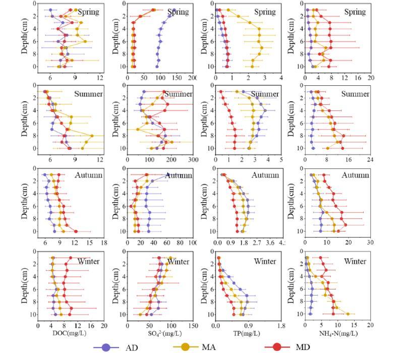 圖5、孔隙水中相關(guān)參數(shù)剖面變化。呈現(xiàn)孔隙水中溶解性有機(jī)碳、硫酸根、總磷和銨氮含量的垂直分布特征及其季節(jié)性變化規(guī)律。