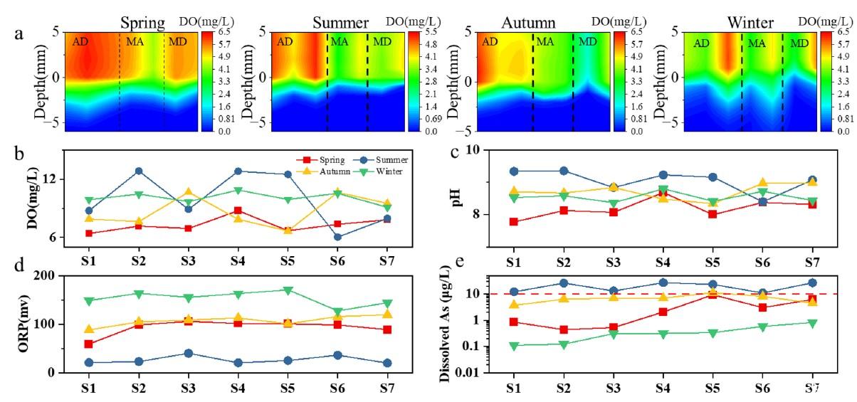 圖1、沉積物-水界面溶解氧、pH、氧化還原電位剖面及水柱參數(shù)變化。展示了沉積物-水界面溶解氧剖面的季節(jié)性變化趨勢,同時(shí)反映了水柱中溶解氧、pH、氧化還原電位以及上覆水中溶解砷含量的變化規(guī)律。