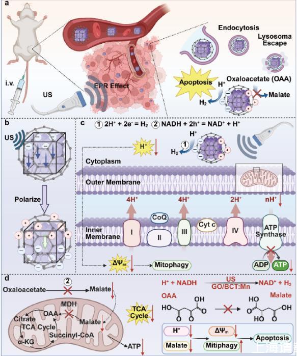 圖1、Go/BCT:Mn MDM.a)合成手術(shù)方案及壓電催化抗癌方案,GO/BCT:Mn MDM抵達(dá)腫瘤部位的作用示意圖。GO/BCT:Mn MDM通過尾靜脈注入小鼠,并通過增強(qiáng)通透性和保留(EPR)效應(yīng)在腫瘤部位富集。GO/BCT:Mn MDM隨后被腫瘤細(xì)胞內(nèi)吞,并通過溶酶體逃逸進(jìn)入細(xì)胞質(zhì)。在超聲刺激下,GO/BCT:Mn MDM極化產(chǎn)生電子-空穴對(duì),電子將H+還原為H2,而空穴通過Seebeck效應(yīng)將NADH氧化為NAD+,阻止OAA轉(zhuǎn)化為蘋果酸鹽,從而誘導(dǎo)腫瘤細(xì)胞凋亡。b)GO/BCT:Mn MDM內(nèi)部極化示意圖。在超聲刺激下,GO/BCT:Mn MDM內(nèi)部電子因機(jī)械力而發(fā)生偏移,形成內(nèi)置電極,并在其表面形成電子和空穴。c)腫瘤細(xì)胞中GO/BCT:Mn的MDM作H+攝入的示意圖。GO/BCT:Mn MDM在超聲刺激下產(chǎn)生的電子將H+還原為H2(反應(yīng)1),從而降低線粒體膜電位(MMP),進(jìn)而降低線粒體呼吸鏈復(fù)合體I-V的活性,最終誘導(dǎo)腫瘤細(xì)胞凋亡。d)GO/BCT:Mn MDM調(diào)控蘋果酸鹽在腫瘤代謝中的耗盡的示意圖。超聲刺激下GO/BCT:Mn MDM產(chǎn)生的空洞將NADH氧化為NAD+(反應(yīng)2),從而抑制OAA轉(zhuǎn)化為蘋果酸鹽。蘋果酸鹽的耗竭阻斷了蘋果酸鹽/天冬氨酸穿梭通路,降低了MMP和線粒體基質(zhì)中蘋果酸的濃度,抑制了三羧酸(TCA)循環(huán),從而影響腫瘤細(xì)胞的能量代謝效率,最終誘導(dǎo)腫瘤細(xì)胞的凋亡。