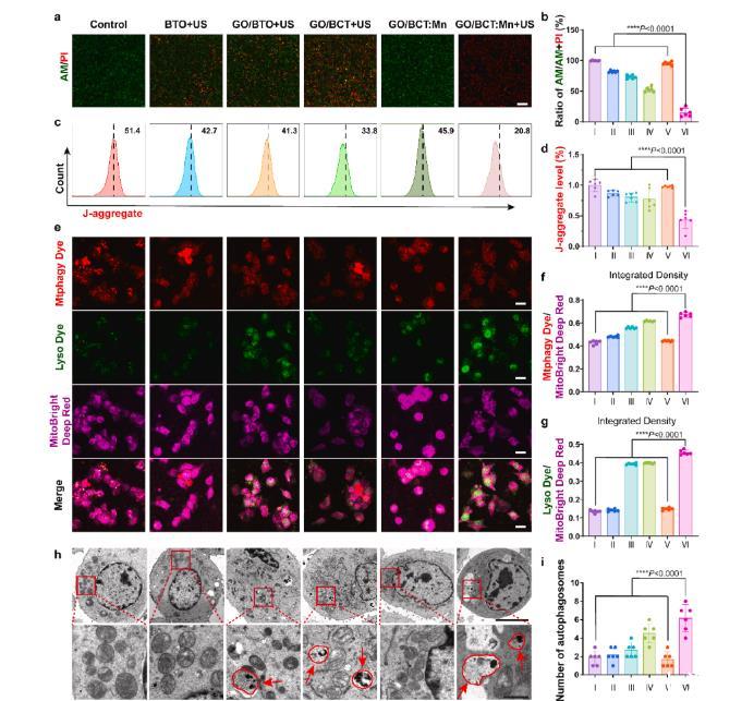 圖4、Go/BCT:Mn MDM與CT26細胞的相互作用。a,CT26細胞與不同PZNPs共培養的CT26細胞(從左到右,對照組和實驗組:BTO+US、GO/BTO+US、GO/BCT+US、GO/BCT:Mn和GO/BCT:Mn+US)共培養12小時后,CT26細胞共培養12小時后,進行活/死染色(1.5 W/cm2,1 MHz,50%占空比)。處理后的細胞用AM(活細胞,綠色)和PI(死亡細胞,紅色)染色。比例尺:200微米b,AM/AM+PI熒光定量,見圖a。c,CT26細胞通過超聲波處理不同PZNP(1.5 W/cm2,1 MHz,占空比50%)處理,隨后進行線粒體膜電位變化的流式細胞術分析。流式細胞術分析顯示CT26細胞線粒體膜電位(以形成J-聚集體數量表示)發生變化。d,流式細胞術中J-聚集體的相對定量。e,評估PZNPs孵育和超聲刺激后CT26細胞絲足吞噬作用。比例尺:20微米。f,自噬體與線粒體比值定量。溶酶體與線粒體比值的定量分析。g,溶酶體與線粒體比值的定量分析。h,TEM用于評估PZNP孵育和超聲刺激后CT26細胞自噬體形成。