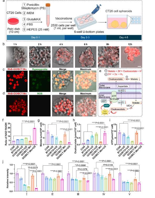 圖5、GO/BCT:Mn MDM與腫瘤球的相互作用。a,腫瘤球體建模示意圖。b,腫瘤球體對GO/BCT:Mn攝取的時間依賴分析。圖示腫瘤球體在0、1、2、4、8和12小時時對RhB-GO/BCT:Mn(紅色)的攝取情況。比例尺:20微米。c,使用Hypoxy探針對腫瘤球組織進行缺氧成像。探針的信號強度(綠色)突出顯示低氧濃度區域,表明腫瘤組織通常存在缺氧微環境。刻度條:20微米,RhB-Go/BCT:Mn超聲刺激后腫瘤球體中活性氧(ROS)生成。圖示了在腫瘤球體共培養RhB-GO/BCT:Mn(紅色)12小時并進行超聲刺激(1.5 W/cm2,1 MHz,50%占空比,3分鐘)后,腫瘤球體中活性氧(綠色)的產生情況。比例尺:20μm。e,超聲刺激后壓電納米粒子對腫瘤能量代謝影響的示意圖。f,腫瘤領域中不同PZNPs(對照組和實驗組:BTO+US、GO/BTO+US、GO/BCT+US、GO/BCT:Mn、GO/BCT:Mn+US)刺激腫瘤球體中的NAD+/NADH比值。g,不同PZNPs超聲刺激后腫瘤球體中蘋果酸鹽濃度,不同PZNPs超聲刺激后腫瘤球體中草酰乙酸酯濃度。i,不同PZNPs超聲刺激后腫瘤球體ATP濃度。j,不同PZNP超聲刺激后腫瘤球體呼吸鏈復合物I-V的活性。