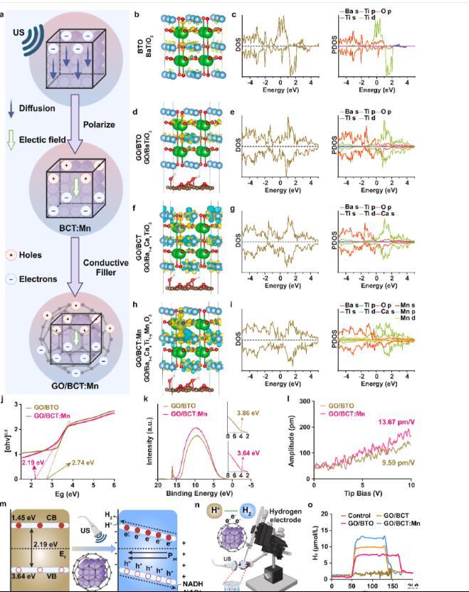 圖3、GO/BCT:Mn.a的第一原理計算及壓電性質分析,超聲刺激下GO/BCT:Mn內部偏振的示意圖。b,BTO晶體結構的幾何表示。本圖闡明了BTO的晶體學排列,突出鋇(Ba)、鈦(Ti)和氧(O)原子的空間定位。c,BTO的態投射圖(DOS,左)和投射態密度圖(PDOS,右)。這些圖示展示了電子態在不同能級上的分布,特別關注原子軌道在費米能級附近的貢獻。d,GO/BTO晶體結構的綜合表示。此圖強調了GO層與晶體結構內BTO粒子之間的界面和鍵合特性。E,GO/BTO的DOS(左)和PDOS(右)示意圖。這些圖示突出了GO引入引發的BTO電子結構變化,特別強調了費米能級電子態的變化,表明電子性質的變化。f,GO/BCT晶體結構的幾何表示。本圖展示了GO/BCT復合結構的結構,其中GO框架與BCT集成。g,GO/BCT的DOS(左)和PDOS(右)示意圖。這些圖提供了關于GO與BCT集成如何影響復合材料電子性質的全面比較分析。h,GO/BCT:Mn晶體結構的幾何表示。該圖強調了Mn在GO/BCT矩陣中的摻入位置,對于理解Mn摻雜對復合材料性質的空間分布及潛在影響至關重要。I)GO/BCT:Mn的DOS(左)和PDOS(右)示意圖。顯示了Μ摻雜導致的電子結構變化,特別是在費米能級附近,顯示導電性和共價性質的變化。j,GO/BTO和GO/BCT:Mn的紫外-可見光(UV–Vis)漫反射光譜(DRS)光譜及其能隙分析。k,GO/BTO和GO/BCT:Mn的紫外光電子光譜(UPS)光譜及其價帶分析。l,由PFM分析的單個GO/BTO納米粒子和單個GO/BCT:Mn納米粒子的d33壓電系數。m,超聲觸發下GO/BCT:Mn的能級變化和電子傳遞示意圖。n,超聲觸發下GO/BCT:Mn生成氫氣機制的示意圖及測試氫電極生成氫的實驗裝置。o,不同組(對照組和實驗組:GO/BTO、GO/BCT、BCT:和GO/BCT:Mn)在超聲觸發(1.5 W/cm2,1 MHz,50%占空比)下氫的產生。