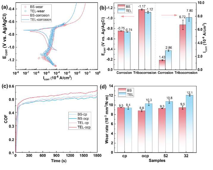 圖3、電化學與摩擦學參數(shù)。(a)動電位極化曲線:滑動使腐蝕電位(Ecorr)負移,TEL中腐蝕電流密度(Icorr)更高。(b)Ecorr與Icorr數(shù)值:TEL中腐蝕速率顯著提升。(c)摩擦系數(shù)(COF):TEL-ocp的COF更高,歸因于硬質(zhì)Al?O?磨粒的形成。(d)磨損率:TEL環(huán)境使磨損率增加超17%,凸顯腐蝕-磨損協(xié)同效應(yīng)。