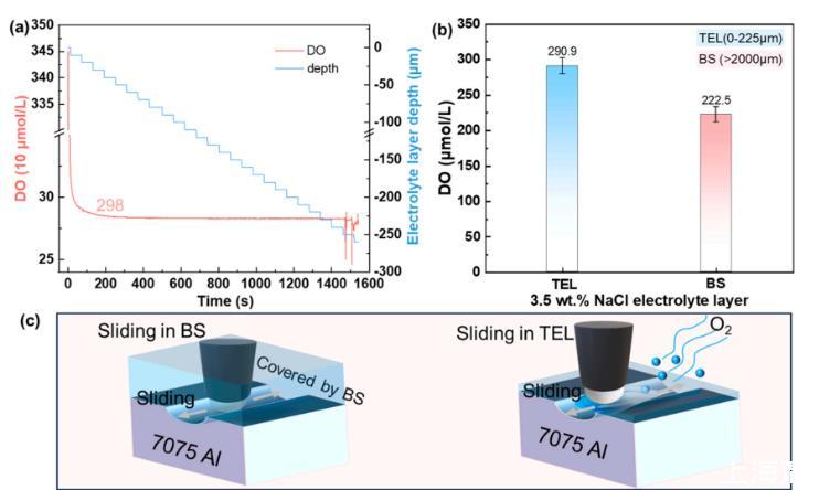 圖4、在BS和TEL環(huán)境中溶解氧的分布情況:(a)在3.5%重量百分比的NaCl溶液中,溶解氧隨深度增加而變化;(b)平均溶解氧濃度;(c)三相腐蝕過程的示意圖。