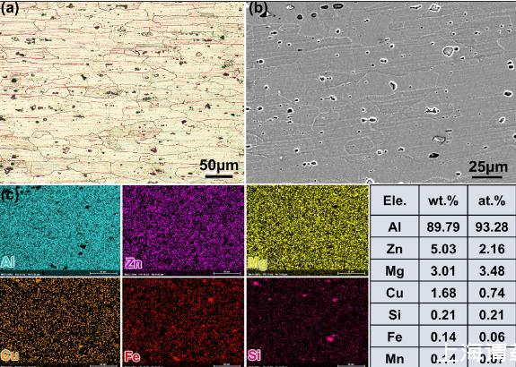 圖2、7075鋁合金的微觀結(jié)構(gòu)。(a)光學顯微鏡(OM)圖像:顯示軋制形成的伸長晶粒和部分再結(jié)晶的等軸晶。(b)SEM圖像及EDS元素分布。