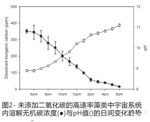 通過(guò)沿遞增輻照度梯度測(cè)量氧氣產(chǎn)生速率來(lái)確定初級(jí)生產(chǎn)力與輻照度曲線。將HRAM培養(yǎng)物等分試樣放入Hansatech氧電極室中,輻照度水平通過(guò)oxyLab32軟件程序(Hansatech Instruments Ltd.,UK)控制。使用在0%和100%空氣飽和水中校準(zhǔn)的Clark型快速響應(yīng)微傳感器(Unisense,Denmark)測(cè)量氧氣產(chǎn)生。輻照度曲線的總孵育時(shí)間為15分鐘,因?yàn)槌醪綔y(cè)量表明,當(dāng)總孵育時(shí)間超過(guò)此時(shí),pH迅速上升,氧氣產(chǎn)生下降(數(shù)據(jù)未顯示)。在光生物反應(yīng)器藻類培養(yǎng)物中也觀察到了類似現(xiàn)象。