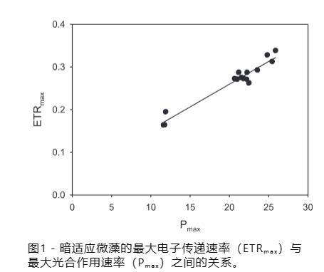 使用葉綠素?zé)晒鈱?duì)輻照度響應(yīng)的快速光曲線評(píng)估CO?處理之間光合潛力的日變化。由于所需時(shí)間以及下午非常高的溶解氧濃度(>300%空氣飽和度)的干擾,全天進(jìn)行光合作用測(cè)量(氧氣產(chǎn)生)不可行。然而,使用本實(shí)驗(yàn)得出的數(shù)據(jù),對(duì)所有HRAMs中暗適應(yīng)微藻的最大電子傳遞速率和最大光合速率進(jìn)行了比較,顯示這兩個(gè)變量之間存在強(qiáng)線性關(guān)系(R2=0.9442;圖1)。在本實(shí)驗(yàn)的背景下,這種關(guān)系支持在無(wú)法測(cè)量P_max時(shí)使用ETR_max來(lái)證明光合潛力。