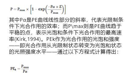 其中Pα是PE曲線線性部分的斜率,顯示光限制條件下光合作用的效率,而P_max是PE曲線趨于平穩(wěn)的點(diǎn),代表光飽和條件下光合作用的最大速率。PE_k,光合作用的光飽和強(qiáng)度,定義為光合作用從光限制轉(zhuǎn)變?yōu)楣怙柡偷墓馑?,從以下方程得出?