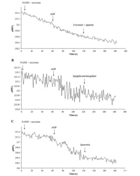 圖6、在存在姜黃素、EGCG或槲皮素的情況下測量純化視桿細(xì)胞外段的呼吸速率。視桿細(xì)胞外段中耦合呼吸速率的代表性電流記錄軌跡。添加物為NADH(0.2 mM)、琥珀酸鹽(20 mM)和ADP(0.1 mM)。然后在(A)中加入姜黃素和胡椒堿(各100 μM);在(B)中加入EGCG(100 μM);在(C)中加入槲皮素(100 μM)。反應(yīng)體積為1.7 mL,使用約40 μg總視桿細(xì)胞外段蛋白。