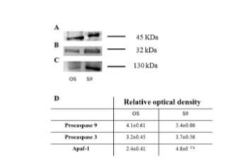 圖8、procaspase 9、procaspase 3和Apaf-1的半定量Western印跡分析。(A-C) 抗procaspase 9、procaspase 3和Apaf-1抗體的半定量Western印跡信號。樣品為分離的視桿細(xì)胞外段(OS)和線粒體富集部分(M)。(D) 使用ChemiDoc軟件(Bio-Rad Laboratories)進行的光密度分析。每個值為平均值±標(biāo)準(zhǔn)差;n=6。