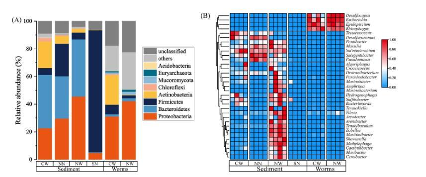 圖4、微生物群落組成分析。(A)在菌群相對豐度大于 1% 的菌群門類水平上,沉積物及蛤蟲腸道中的微生物群落組成情況 (B)沉積物及蛤蟲腸道中不同微生物屬的熱圖,至少有一個樣本的相對豐度大于 1%。CW:有蟲的清潔沉積物;NN:無蟲的含碘汞樣本沉積物;NW:有蟲的含碘汞樣本沉積物;SN:無蟲的消毒含碘汞樣本沉積物。