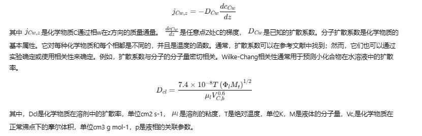 其中 jC w, z 是化學物質C通過相w在z方向的質量通量。 dcC w/dz 是任意點Z處C的梯度, DC w 是已知的擴散系數(shù)。分子擴散系數(shù)是化學物質的基本屬性。它對每種化學物質和每個相都是不同的,并且是溫度的函數(shù)。通常,擴散系數(shù)可以在參考文獻中找到;然而,它們也可以通過實驗確定或使用相關性來確定。