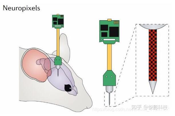 在空間分辨率方面有重大突破的當屬Neuropixels神經電極[2]。Neuropixels神經電極的形狀為寬70 um,長10mm的針狀,在電極上分布有多達960個12 um*12 um的方形神經電信號采集位點。研究證明,當用兩個Neuropixels神經電極同時植入大鼠的腦內,可以同時采集來自于5個腦區大于700個神經元的動作電位。