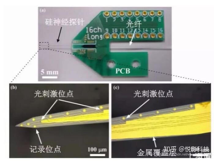 還有研究者在神經微電極上集成LED光刺激位點,可實現對神經信號進行光刺激的同時采集神經電信號[6],如下圖所示。