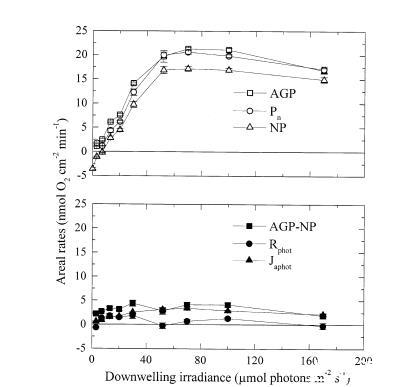 | AGP對E曲線的初始斜率 \( \alpha \) (mol O? mol photons?1) | 0.106 (±0.002) | 0.042 (±0.002) | 0.009 (±0.001) |