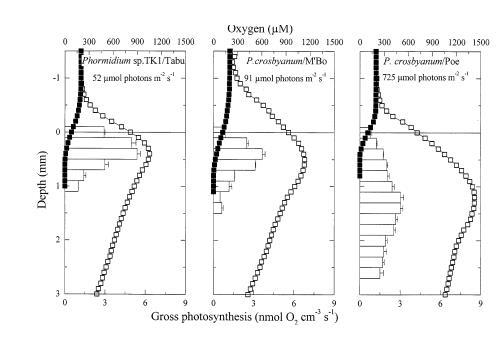 在飽和光照條件下,總光合作用最大值與最大氧氣濃度處于相同的深度層位。Phormidium sp. TK1/ Tabu和P. crosbyanum / M'Bo的光區(qū)分別為1毫米和1.4毫米。在P. crosbyanum / Poe中,可測量的總光合作用深度達2.2毫米。在Phormidium. sp. TK1/ Tabu觀察到最高的最大總光合作用速率,在表面以下0.4毫米處值為5.5 nmol O2 cm-3 s-1。在P. crosbyanum / Poe觀察到最低的最大速率,即在微生物巖表面以下1.2毫米處為3.01 nmol O2 cm-3 s-1。
