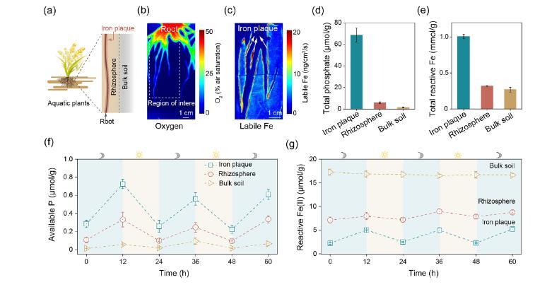 圖3、反應(yīng)性礦物質(zhì)相(RMPs)能夠調(diào)節(jié)根部周圍的磷遷移。a) 一幅鐵斑、根際土壤以及圍繞根部的整體土壤的示意圖。b、c 0水生根表現(xiàn)出徑向氧流失(ROL),在感興趣的區(qū)域內(nèi),鐵斑吸附在根表面。d、e) 用鹽酸從鐵斑、根際土壤以及整體土壤中提取的總磷酸鹽和總反應(yīng)性鐵。f、g 在鐵斑、根際土壤以及整體土壤中有效磷和反應(yīng)性 Fe(II) 的晝夜變化。誤差條表示三個(gè)重復(fù)實(shí)驗(yàn)的標(biāo)準(zhǔn)偏差。若誤差條不可見,則包含在標(biāo)記符號(hào)內(nèi)。