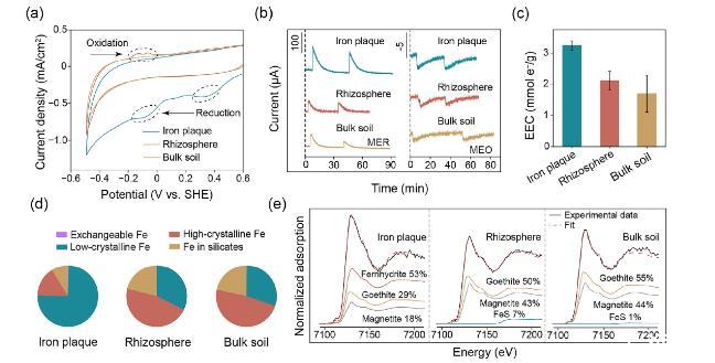 圖2、根部附近形成反應(yīng)性礦物相(RMPs)。a )電流-電位曲線(以標(biāo)準(zhǔn)氫電極為參照,已報(bào)告數(shù)據(jù))顯示了氧化還原活性。b )介導(dǎo)電化學(xué)還原(MER)和氧化(MEO)曲線,以及 c )鐵斑、根際土壤和整塊土壤的電子交換容量(EEC)測(cè)量值。d )通過順序化學(xué)萃取表征的鐵組分。e )通過 X 射線吸收光譜鑒定的鐵物種。誤差條表示三個(gè)重復(fù)樣本的標(biāo)準(zhǔn)偏差。當(dāng)誤差條不可見時(shí),它們包含在標(biāo)記符號(hào)內(nèi)。