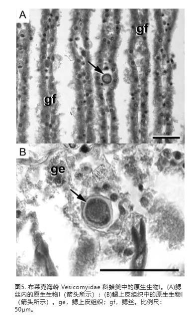 原生生物 I. 原生生物 I 是最流行的寄生蟲,存在于35%的受檢蛤的鰓中。原生生物 I 的感染密度范圍為每橫截面0到0.24個包涵體。原生生物 I 呈球形(直徑15微米;范圍=8微米至22微米),包在細胞壁內,通常被一個1微米到2微米厚、不規則、透明的光暈所包圍(圖5A,B)。較大標本的光暈最為明顯,寄生蟲內部呈現明顯的顆粒狀外觀,而較小的原生生物 I 寄生蟲內部往往不那么不透明且缺乏顆粒度。較小的原生生物 I 標本通常不與宿主反應相關,但較大的個體(>14微米)有時會引發包裹作用,這是一種涉及識別和隔離異物的特征性防御反應(Smolowitz等人,1997)。除了鰓結構的局部破壞和透明光暈外,沒有與此寄生蟲類型相關的病理變化。