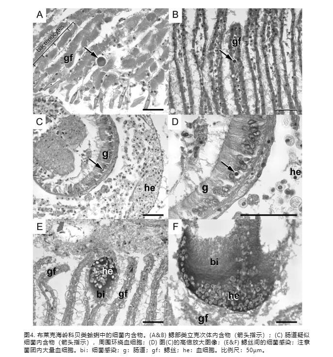 細菌感染 I. 細菌寄生最具致病性的實例出現在28%的個體中。這種感染被稱為細菌感染 I,其特征是桿狀細菌在鰓絲之間和之中大面積、彌散的聚集(圖4E,F)。由于這些感染并不總是完全被宿主組織包圍,因此未使用“包涵體”一詞。細菌感染 I 總是與血細胞浸潤相關(每個橫截面有幾個到幾百個血細胞的聚集體[直徑200微米])。血細胞包圍并浸潤細菌團塊,有時它們自身也被一個清晰的邊界包圍,表明被細菌空泡化。與細菌感染相鄰的鰓絲顯示出細菌細胞退化、斷裂和空間破壞的證據(圖4F)。
