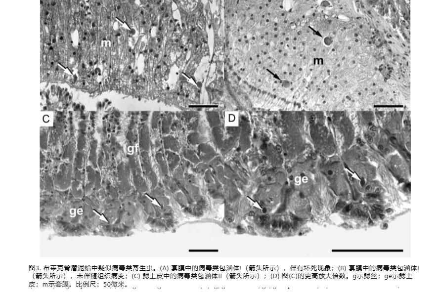 病毒樣包涵體 I. 病毒包涵體 I(直徑10微米)位于外套膜組織中(圖3A,B)。球形或卵圓形包涵體呈嗜酸性,在光學顯微鏡下缺乏可辨別的內部結構,并具有蠟樣、玻璃紙狀特征。包涵體周圍的外套膜組織出現退化,偶爾有輕微的血細胞浸潤與這些包涵體相關。病毒樣包涵體 I 出現在8%的受檢個體中;感染密度范圍為每橫截面0到0.24個包涵體。