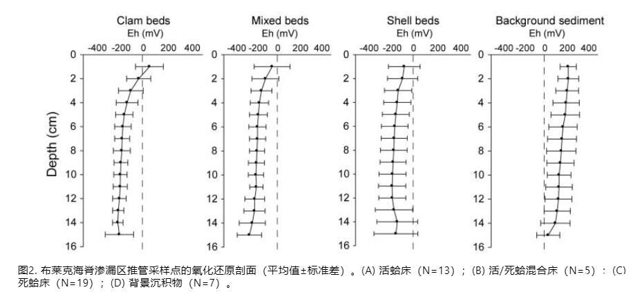 圖 2.黑崖海丘囊蛤推桿巖心中的沉積物氧化還原剖面。(A) 活蛤床,(B) 混合(活蛤和蛤殼)床,(C) 蛤殼床,(D) 背景(非滲口)沉積物。誤差線代表平均值±1個標準誤(N=7-19個巖心)。