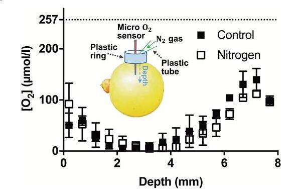 [O[O 2 2]霞多麗漿果(2016-2017年產季為90 DAA,Waite葡萄園)的]分布圖,使用和不使用N 2在測量過程中在入口點氣體進行測量。插圖:用于測量漿果[O實驗裝置2]剖面的(不按比例)。將O 2傳感器(尖端直徑25μm)插入漿果的赤道處,并大約穿過半徑向內移動到中心。在傳感器的入口周圍,一個塑料環被密封并粘在漿果上,以容納輕輕流到傳感器入口點的氮氣。數據是平均值±SE,n=3。雙向方差分析(重復測量)顯示,深度占總變異的68.73%(P<0.0001),處理占總變異的0.55%(P=0.26),交互作用占總變異的3.72%(P=0.87)。