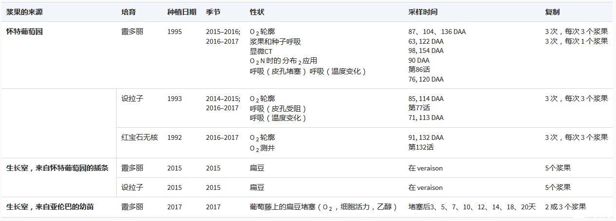 漿果來源、葡萄樹齡、采樣時間和相應測量的詳細信息列于表1中。來自Waite Campus(34°58'04.8'''S,138°38'07.9''''E)葡萄園的漿果在2014-2015、2015-2016和2016-2017季節采樣。成熟的設拉子、霞多麗和紅寶石無核葡萄藤在標準的葡萄園管理下生長在自己的根上,垂直枝條定位,修剪枝條(兩個芽),在帶有頁巖碎片的深棕色粘土上滴灌,分級為紅棕色斑駁粘土;覆蓋在橄欖褐色斑駁的開裂粘土上(Du Toit,2005)。行(3 m間距)是南北向的。三個重復每個由兩個葡萄藤組成,每個重復的設拉子和三個葡萄藤的霞多麗。在每個重復中標記10個隨機簇(近端和遠端的組合),每個重復在09:00之間的每個采樣日期在花梗-軸交界處用鋒利的剪刀切下20個漿果(每個簇中的兩個,隨機位于簇內)小時和11點。紅寶石無核葡萄從三個葡萄藤中取樣,每個葡萄藤上有五個標記用于取樣的簇,并且從每個葡萄藤中取樣20個漿果。漿果發育過程中的采樣時間以開花后的天數來衡量(DAA,50%的花冠從花上掉下來)。漿果用密封塑料袋裝入冷卻容器中,帶回實驗室,4℃避光保存,取樣后48小時內進行檢測。