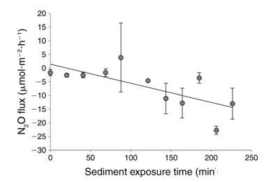 這些潮灘主要由粉砂/粘土沉積物組成(Viggato 2013),平均干容密度為 1.2 6 0.04 g/cm3,平均孔隙度為 0.72 6 0.02(n 93)。在我們的 7 月和 8 月采樣日期,平均沉積物溫度分別為 24.28、30.58 和 27.58C,沉積物含水量(SWC)在整個低潮期間保持飽和或接近飽和(表 1)。此外,氧氣滲透深度、孔隙水氧濃度和沉積物需氧量(SOD)在整個采樣期間保持相對恒定(表 1)。總體而言,沉積物 N2Ofluxes 范圍為—22 至 27 lmol.m—2.h—1,平均值為—6.7 6 2 lmol.m—2.h—1.In事實上,測量的 34 個核心中有 30 個表現出 N2O 吸收(表 1)。平均 N2Oflux 與沉積物暴露時間之間存在顯著關系(P = 0.0128;圖 1)。特別是,我們觀察到在最后一小時明顯更多的 N2O 吸收與第一小時相比低潮(P,0.05)。所有三個的平均 N2Ofluxes 之間沒有顯著關系 采樣日期和溫度或平均 SOD。然而,在三個單獨的采樣日期中的兩個,N2Ofluxes 和 SOD 確實表現出顯著的關系。特別是,在 7 月 31 日,這種關系為 y?—0.0008x—0.44(R2?0.35,P,0.05 ),并且在 8 月 8 日,關系轉變為 y?—0.009x—0.27(R2?0.58,P,0.05)。