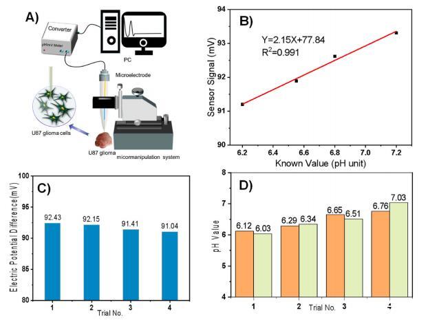 圖5. A) 微操作平臺系統。B) 微電極pH檢測方法的標準曲線。C) 使用微電極測量時,小鼠膠質瘤細胞不同位置對應的電位差。D) 通過PH微電極測量的小鼠膠質瘤不同位置pH值與SERS方法測量結果的對比。