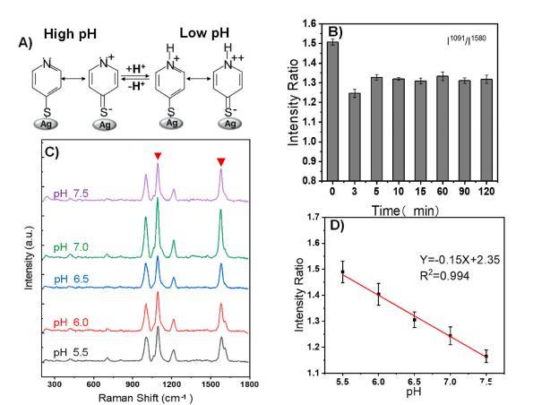 圖3. A) 吡啶分子結構在酸性和堿性條件下變化的示意圖。B) 不同響應時間下獲取的相同pH條件下4- MPY 兩個特征峰(I1093/I1584)的比值。C) 4- MPY 在不同pH緩沖液中響應的SERS光譜。D) 4- MPY 兩個特征峰(I1093/I1584)的比值及其pH值與線性擬合曲線。