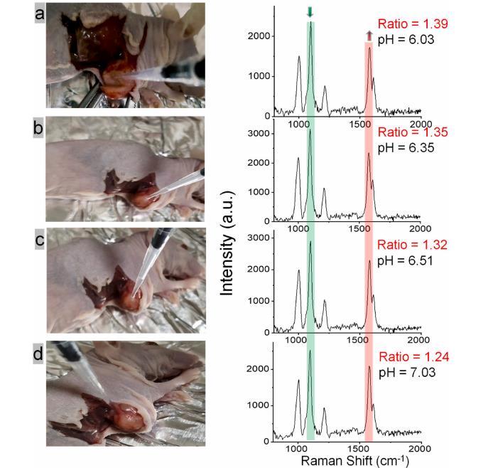 將上述SERS芯片用于膠質瘤組織間液的測量。首先,通過細胞懸液植入法將U87膠質瘤細胞懸液注射到胸腺切除小鼠的上肢腋下。培養14天后,獲得約1.0 cm3的膠質瘤。在局部麻醉下,將小鼠異位膠質瘤細胞完全剝離。為了收集小鼠膠質瘤細胞微環境的局部pH值,將4.0 μL水滴滴在小鼠膠質瘤細胞表面,以將組織間液提取到水滴中。10秒后,用移液器重新吸取,然后重新滴在SERS基底上進行SERS測量。收集小鼠膠質瘤的四個不同位置,并在每個位置測量10個SERS光譜。從結果中我們可以觀察到4-MPY具有很高的SERS活性,其信號在記錄的SERS譜圖中占主導。計算了I1091/I1580的比值,并獲得了相應的pH值(圖4)。可以看出,膠質瘤的局部微環境呈酸性。隨著測量位置接近腫瘤邊緣,腫瘤的pH值逐漸升高。因此,我們可以推斷該技術可用于確定腫瘤邊界。當微環境的局部pH處于生理范圍(7.35~7.45)內或大于此范圍時,證明腫瘤尚未侵入該區域,手術中可以保留該區域組織。