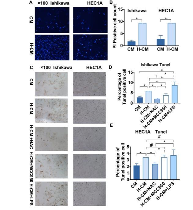 圖5:氫氣通過 ROS 和 NLRP3 炎癥小體誘導子宮內膜癌細胞焦亡。(a, b)代表性熒光圖像和定量分析顯示,經 H-CM 或 CM 處理的 Ishikawa 和 HEC1A 細胞中,碘化丙啶(PI)陽性細胞(紅色,指示膜完整性喪失)增多。(c, d)代表性圖像和定量分析顯示,經指定處理(H-CM、CM、NAC、MCC950、LPS)的 Ishikawa 和 HEC1A 細胞中,TUNEL 陽性細胞(綠色,指示 DNA 斷裂)增多。細胞核用 DAPI 復染(藍色)。比例尺,50μm。(e)不同處理組 Ishikawa 細胞中 TUNEL 陽性細胞的定量總結。所有數據均為均值 ± 標準差(n=3)。*P < 0.05,與 CM 組比較;#P < 0.05,與 H-CM 組比較。
