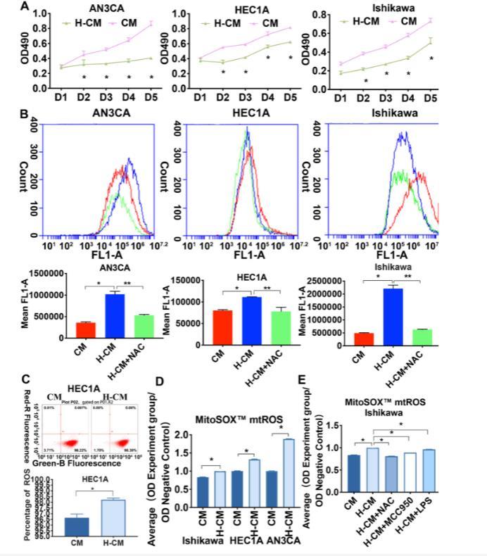 圖4:氫氣處理誘導子宮內膜癌細胞中 ROS 生成并降低細胞活力。(a)MTT 法檢測 AN3CA、HEC1A 和 Ishikawa 細胞在正常培養基(CM)或富氫培養基(H-CM)中培養不同時間(24-120 小時)后的細胞活力。(b, c)使用 DCFH-DA 探針通過熒光顯微鏡檢測和量化 AN3CA、HEC1A 和 Ishikawa 細胞在指定處理后的總細胞內 ROS 水平。NAC 作為 ROS 抑制劑加入。(d)使用 MitoSOX Red 探針檢測和量化 AN3CA、HEC1A 和 Ishikawa 細胞中的線粒體 ROS(mtROS)水平。(e)在 Ishikawa 細胞中,使用 NAC(ROS 抑制劑)、MCC950(NLRP3 抑制劑)或 LPS(NLRP3 激活劑)與 H-CM 共同處理,評估 mtROS 水平。所有數據均為均值 ± 標準差(n=3)。*P < 0.05,與 CM 組比較;#P < 0.05,與 H-CM 組比較。