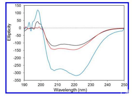 圖 4. SwMb·2(黑色)、全 SwMb(紅色)和脫輔基-SwMb(藍色)在 190 到 260 nm 范圍內的圓二色性光譜。樣品在 50 mmol L-1 Tris-HCl(pH 7.0)緩沖液中,濃度為 0.1 mmol L-1。