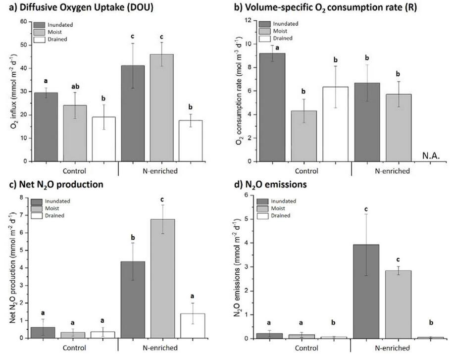 圖4、O2消耗量和N2O排放量和凈產量。a)O2流入量(DOU)(mmolm-2d-1)根據測量的O2曲線計算并按養分處理(對照、富氮)和淹沒狀態(淹沒、潮濕、排水)分組。b)體積比O2消耗率(R)(mol m-3 d-1),由測量的O2分布除以滲透深度計算得出,并按養分處理(對照,富氮)和淹沒狀態(淹沒,潮濕,排水)。O 2無法獲得富氮排水土壤的消耗率(NA),因為無法確定相應的穿透深度,因為O2穿透剖面提前停止以最大限度地降低傳感器破損的風險(達到的最大深度=12毫米)。c)凈N2O產量(mmolm-2d-1)從測量的N2O曲線計算并按養分處理(對照,富含N)和淹沒狀態(淹沒、潮濕、排水)分組。d)N2O排放量(mmol m-2 d-1)從測量的N2O計算剖面并按養分處理(對照、富氮)和淹沒狀態(淹沒、潮濕、排水)分組。