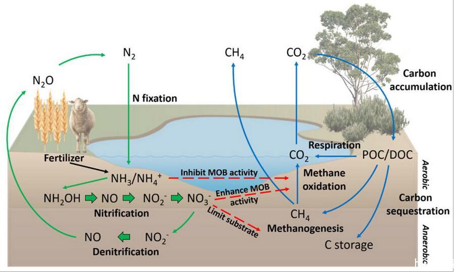 圖1、濕地中的碳和氮循環。綠色箭頭代表N循環過程,而藍色箭頭代表C循環過程。增加水位促進電子受體(即NO3-)的可用性,創造產甲烷所需的厭氧條件,并限制甲烷氧化對CH4的消耗。肥料(NO3-或NH4+)的輸入可以通過影響將CH4氧化成CO2的甲烷氧化細菌(MOB)的活性來影響CH4的產生和排放(紅色虛線箭頭)(甲烷氧化)并通過限制可用于產甲烷的底物。