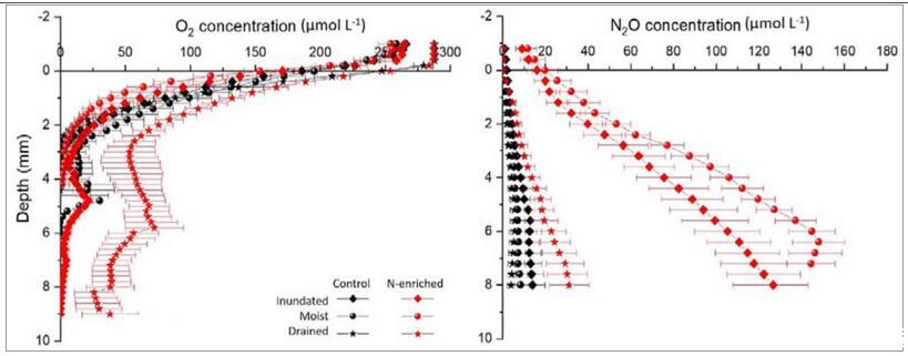 圖3、O2和N2O濃度的深度微觀剖面。a)O2濃度分布按養分處理(對照、富氮)和淹沒狀態(淹沒、潮濕、排水)分組。b)N2O濃度分布按養分處理(對照、富氮)和淹沒狀態(淹沒、潮濕、排水)分組。