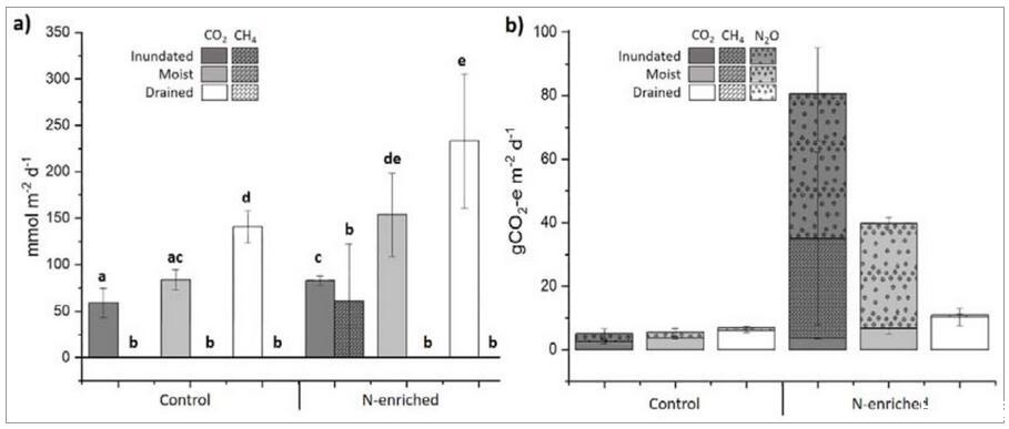 研究結果表明,物理(即水的變化)和化學(即銨基氮肥添加)人為干擾對溫室氣體的產生和排放有重大影響。研究發現,無論養分處理如何,排水條件下的土壤樣品的O 2消耗率總體較低,而CO 2排放量高于潮濕和淹沒的土壤。添加氮肥后,在潮濕和淹沒的土壤中檢測到最高的N 2 O排放和O 2擴散吸收,而最高的CH 4排放僅在淹沒土壤中測量??傮w而言水文恢復的第一反應有助于減少CO 2排放。然而,氮肥添加和水分存在的綜合影響導致GWP增加了近14倍。