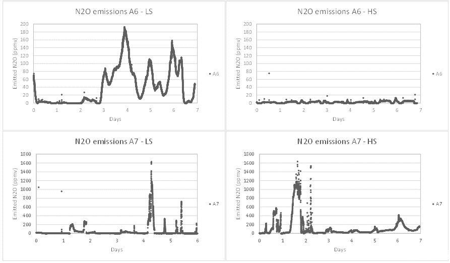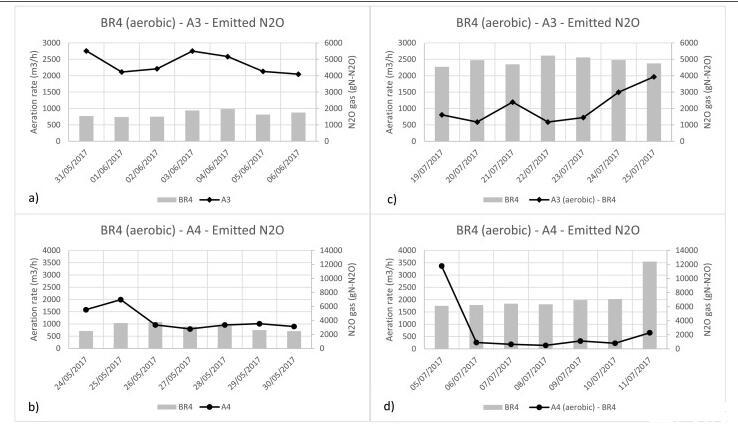 圖3、BR4淡季(LS)采樣位置a)A3和b)A4和BR4(HS)旺季采樣位置c)A3和d)A4的N2O排放和曝氣率比較。N2O排放的主要貢獻者是兩個季節的BR4,該反應器中排放的每日動態(加上曝氣率)。HS期間的排放量低于LS期間。在LS期間,與HS相比,排放更不穩定。