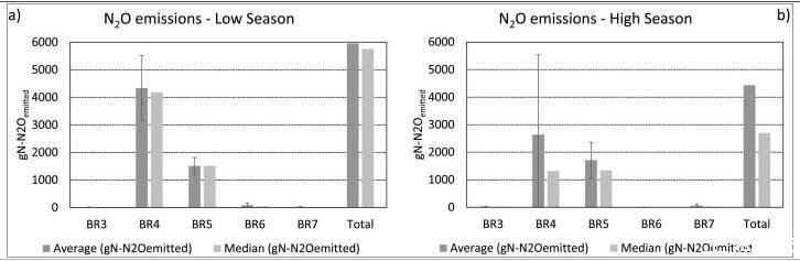 圖2、a)LS(淡季)和b)HS(旺季)期間反應器的N2O排放。從圖中可以看出,在淡季發現了較高的總N2O排放量。生物反應器4(BR4)對污水處理廠N2O總排放量的貢獻最大,其次是BR5,缺氧區(BR3和BR6)和最終好氧區(BR7)在兩個季節的貢獻均不顯著.旺季總排放量減少的主要原因是BR4的N2O排放率較低。