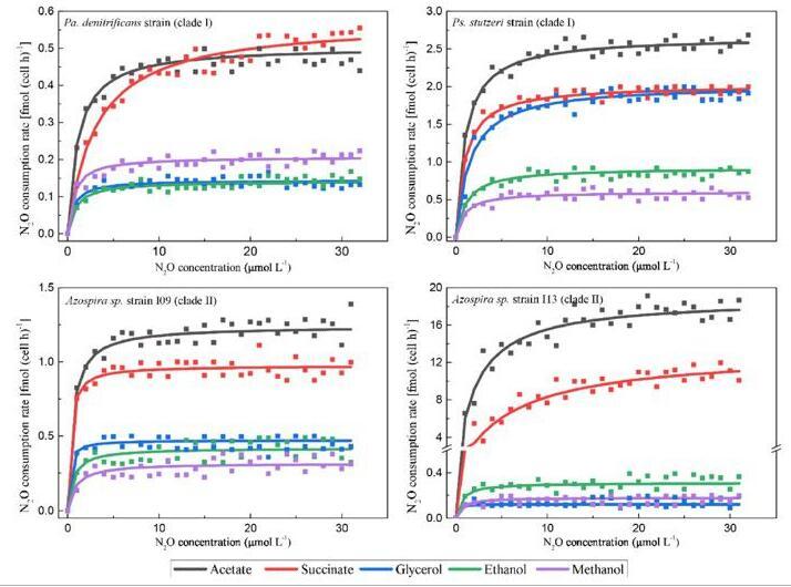 利用一氧化二氮(N2O)還原細菌是減少工程系統的N2O足跡的一種很有前景的策略。使用優選的有機碳源作為電子供體可加速這些細菌對N2O的消耗。然而當喂食不同的有機碳物種時,它們的N2O消耗潛力和活性仍不清楚。本論文研究人員通過研究它們的生物動力學特性和基因組潛力,系統地比較了各種有機碳源對N2O還原細菌活性的影響。五種有機碳源——乙酸鹽、琥珀酸鹽、甘油、乙醇和甲醇被送入四個含有進化枝I或進化枝II nosZ基因的N2O還原細菌。使用Unisense微呼吸系統對四種N2O還原細菌菌株進行了呼吸測定分析,確定了響應于不同喂養方案的溶氧和N2O消耗生物動力學的不同變化。不管N2O還原菌是什么,使用乙酸鹽和琥珀酸鹽都獲得了更高的N2O消耗率和更高的生物質產量。通過基因組分析研究了代謝補充碳源的潛力,其結果證實了N2O消耗生物動力學結果。此外,電子供體的選擇對N 2O消耗活動在氧氣暴露后恢復。本研究的結果有助于為污水處理廠異養反硝化過程中產生和排放的N 2 O制定有效的緩解策略