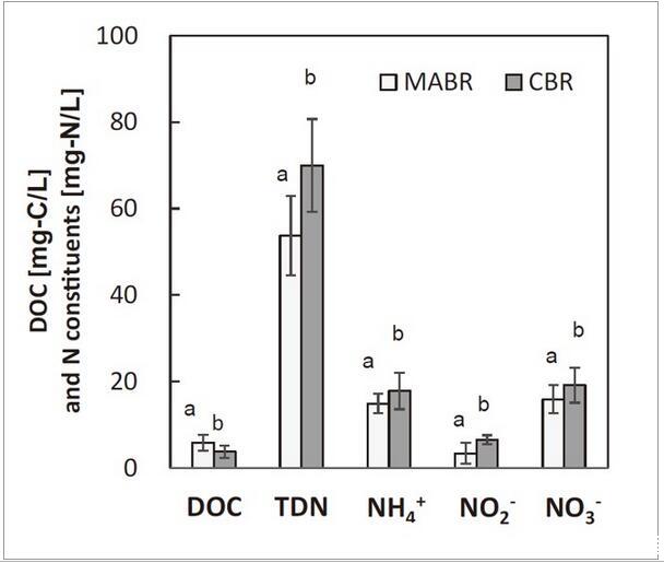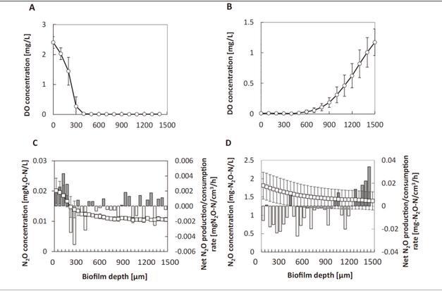 在本論文研究中,研究人員證明了SND的MABR可以減少N2O排放的概念。為此進行了反應器操作和原位生物膜深度研究此項研究揭示了(i)具有反擴散生物膜幾何形狀的MABR是否允許比具有共擴散生物膜幾何形狀的傳統(tǒng)生物膜反應器(CBR)更低的N2O排放量;(ii)N2O還原菌豐度和活性的空間分布如何變化,在生物膜反擴散生物膜中的微生物群落結構是否不同取決于生物膜的深度。為了解決這些研究問題,研究人員將微電極技術(unisense)原位的測試出膜生物反應器中生物膜中的氧氣及氧化亞氮的濃度,并與分子微生物學方法相結合。定量PCR和高通量測序技術16S rRNA基因擴增,比較反擴散和共擴散生物膜。本研究是第一次直接比較MABR和CBR在整體和空間分解的N2O產量/減少和作為生物膜深度功能的微生物群落組成方面的結果。2種生物膜分別采用逆流和共流基質擴散結構,在相同負荷率下,對低DOC/TDN為1.0的高含氮廢水進行同時硝化反硝化。上述研究結果證明了MABRs有望成為一種小足跡技術,既能實現有效的同步硝化/反硝化,又能減緩N2O排放。