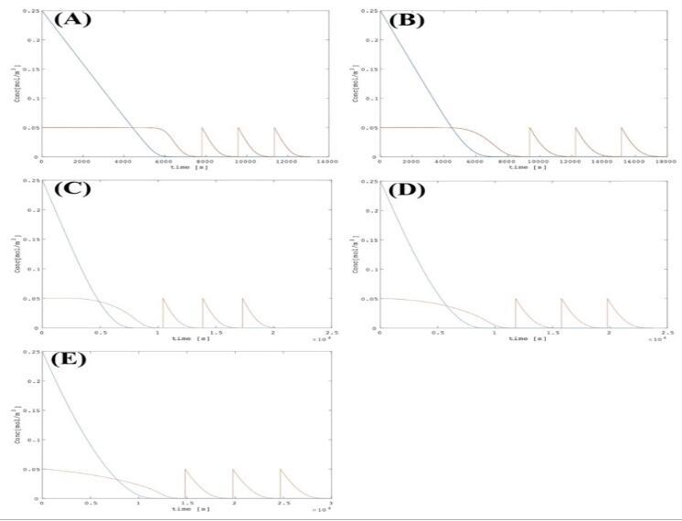 圖4、利用開發(fā)的模型模擬N2O(紅色)和O2(藍色)濃度隨時間的變化。球形凝膠的直徑設定為(A)1 mm,(B)2 mm,(C)3 mm,(D)4 mm,(E)6 mm。當N2O濃度低于0.00005 mol/m3(0.05μM)時,N2O濃度會自動增加到初始濃度(0.05 mol/m3),實驗條件下觀察到的N2O峰值。這個過程重復了三次。