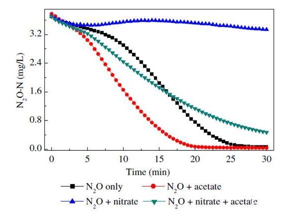 圖4、不同條件下的N2O還原特征,只存在氧化亞氮,同時存在氧化亞氮和乙酸鈉,同時存在氧化亞和硝酸鹽,同時存在氧化亞氮、硝酸鹽和乙酸鈉。從圖中可以看出當存在外碳源乙酸時,氧化亞氮的還原速率明顯加快。這要是因為乙酸的降解速率比PHA碳源快倍6-20倍,氧氧化亞氮還原酶在單位時內能夠獲得充足的電子進行N2O的還原。存在硝酸鹽的時候,N2O的還原受附,甚至還冇上升的趨勢。硝酸鹽還原對電子的競爭優勢要大于氧化亞氮還原酶,PHA氧化產生的子要首先硝酸鹽的還原。外碳源乙酸和乙酸鉀共同投加時,N2O的還原并沒有受到限制,這主要是因為乙酸中位時間內捉供的電子能夠同吋滿足NO3-和N2O的還原。