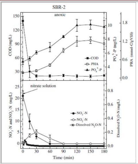 圖2、SBR-1反應器中COD、PHA、PO43--P、NO3--N-、NO2-N以及溶解性的N2O變化趨勢。從圖中可以看出SBR主要進行反硝化脫氮和除磷反應。厭氧階段。COD在30分鐘內降低到最低水平,并且伴隨著糖原的分解,PHA的合成以及PO43--P的釋放。缺氧階段主要進行硝酸鹽的降解,以及憐酸鹽的吸收;并且伴隨著的分解和糖原的合成。而N2O的產生主要發生在的缺氧階段,厭氧階段兒乎沒有的產生;一旦KNO3溶液加入到反應器中,溶解性的濃度迅速增加,并在缺氧反應第15分鐘到最大值0.87mg/L,隨后溶解性的N2O濃度逐漸降低到0mg/L。
