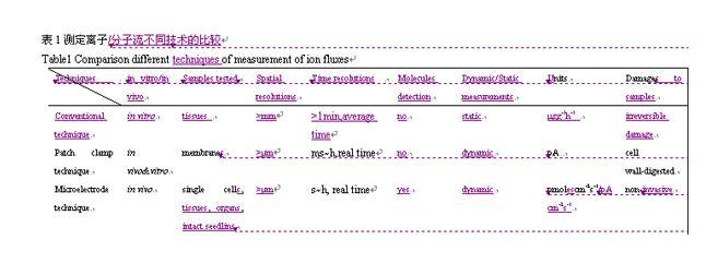選擇性微電極技術的最大優點,是在保持被測植物樣品完整(即不造成任何損傷)和接近實際生理狀態環境下進行測定,并能實時、連續地獲得進出活體植物組織、器官、單個細胞甚至細胞器內特定離子或分子活度計移動速率。雖然膜片鉗技術也能實時監測植物生物膜離子通道的離子(電)流(ion current)變化,但是它只能用于研究脫去細胞壁后的生物膜的離子通道(電)流(許越和邱澤生1993;朱俊英等2006),使得它在植物上很難廣泛應用。當然,現在也有研究者把選擇性微電極技術與膜片鉗技術結合起來,同時監測生物膜的離子流(動)(ion flux)和離子(電)流(Tyerman等2001;Gilliham等2006),這為實時探明不同環境下生物膜離子通道、載體或泵活性的變化提供了很好的研究平臺。選擇性微電極技術與膜片鉗技術及常規技術相比具有明顯的優點,上述3種方法在測定離子流時的差異見表1。