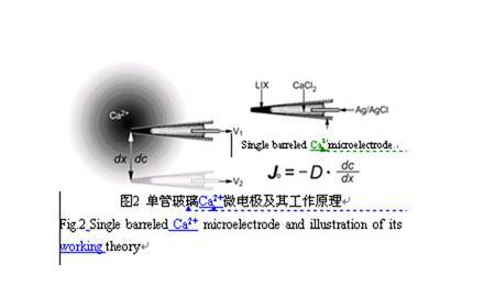 μ=μo+RT㏑γc+zFVb,式中μo為電化學勢參考值,z為離子化合價數,γ為離子在溶液中的活動系數,F為法拉第常數(96500 C/mol),R為氣體常數(8.3 J mol-1K-1),T為熱力學溫度(K)。當離子選擇微電極的尖端緩慢移動(不攪動溶液)一段距離(dx)時,新位置處的電化學勢為μ+dμ,此處的dμ為新位置處的濃度c與電勢Vb的變化值,而電化學勢參考值μo不變。標準電化學理論認為,根據離子濃度c(mol/m)、離子的運動速度u(m s-1mol-1newton-1)以及電化學勢梯度(dμ/dx),就能計算出離子的凈流量J(mol m-2s-1):